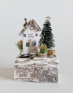 A little white cottage with fir tree, logs, star, seashell, present, and a mussel shell Boat.