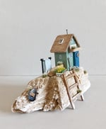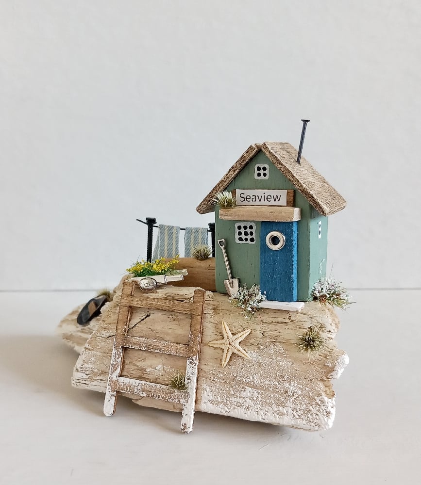 Set on a gorgeous piece of pale weathered driftwood, A Life By The Sea features a little beach house, laundry line, mussel shell Boat, wheelbarrow, shovel, a tiny natural starfish and flowers/grasses.