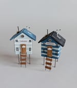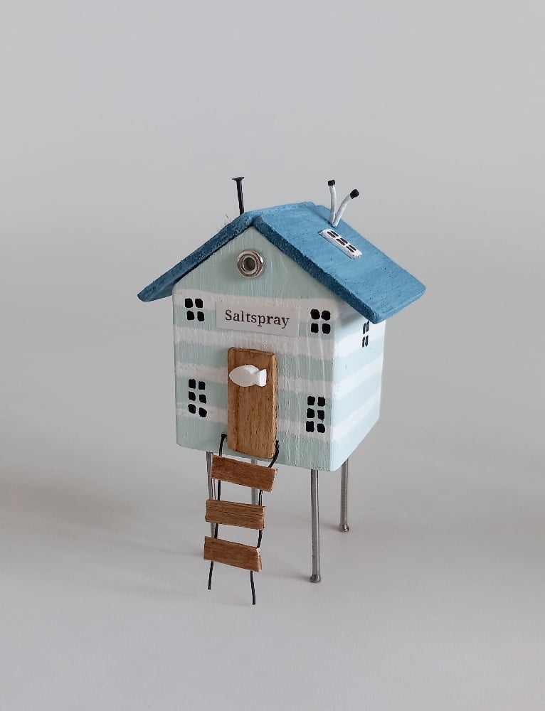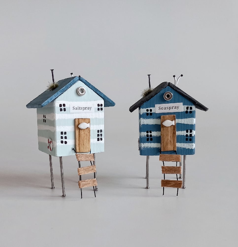 Miniature beach cabins on stilts with a ladder, seagull, porthole window, life belt and a tiny white clay fish on the Cabin door.