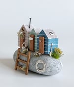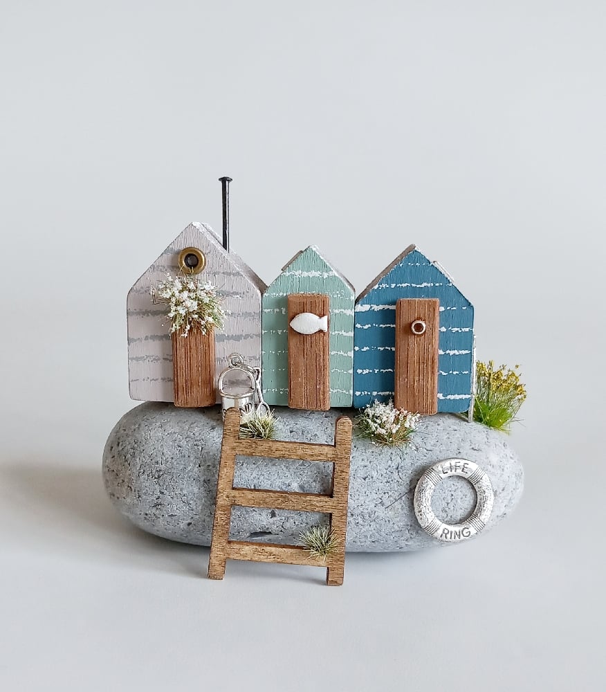 A row of miniature Beach Huts with a ladder, coastal flowers, life belt, bucket & spade and a tiny white clay fish 🐟.