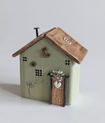 A green wooden cottage with a driftwood door, painted dandelion seedhead, a bird and a tiny white clay heart on the cottage door π€