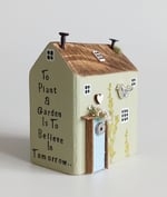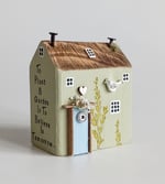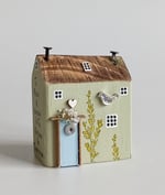 A wooden cottage in green & blue with wildflowers and a little bird.