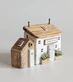 A rustic Seaside Cottage with driftwood accents, a little shed, porthole window, flower planters, and a seashell.