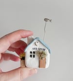 A miniature clay Beach Cottage in white and pale blue, featuring a tiny silver fish & driftwood accents.