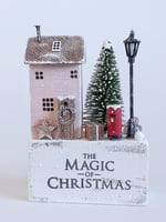 A Christmas cottage scene set on driftwood block painted white to resemble snow 🌨 featuring a little pink cottage, fir tree, lamppost, logs, snowball, wooden star, post box and a Christmas gift 🎁