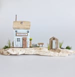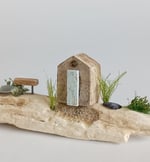 Set on a beautiful, pale piece of weathered driftwood, Tideline Cottage features sea grasses, a little shed & bench, a tiny mussel shell and natural starfish, and a gorgeous nugget of frosted sea glass.