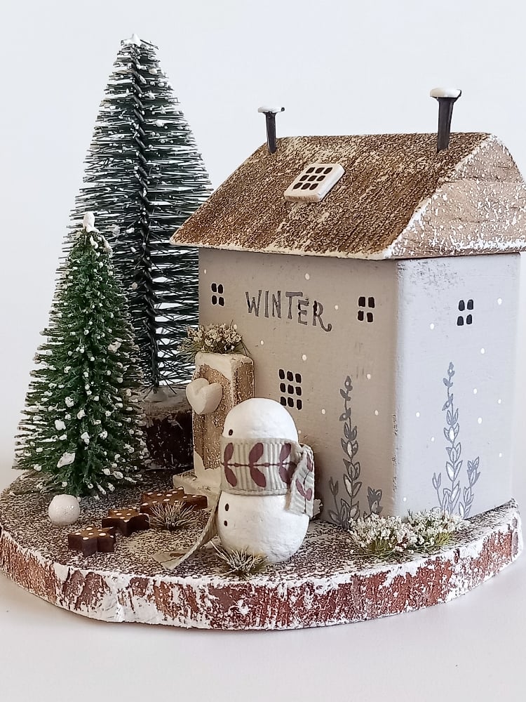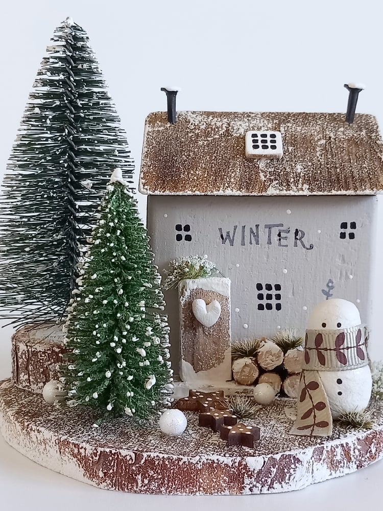 A Winter woodland scene featuring a pale grey driftwood house with fir trees, logs, snowballs and a handmade clay Snowman ⛄️