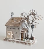 A grey Driftwood Cottage with log store and a bare winter tree. This scene features a black lamppost, snow shovel, bicycle and a tiny white clay heart on the door 🤍